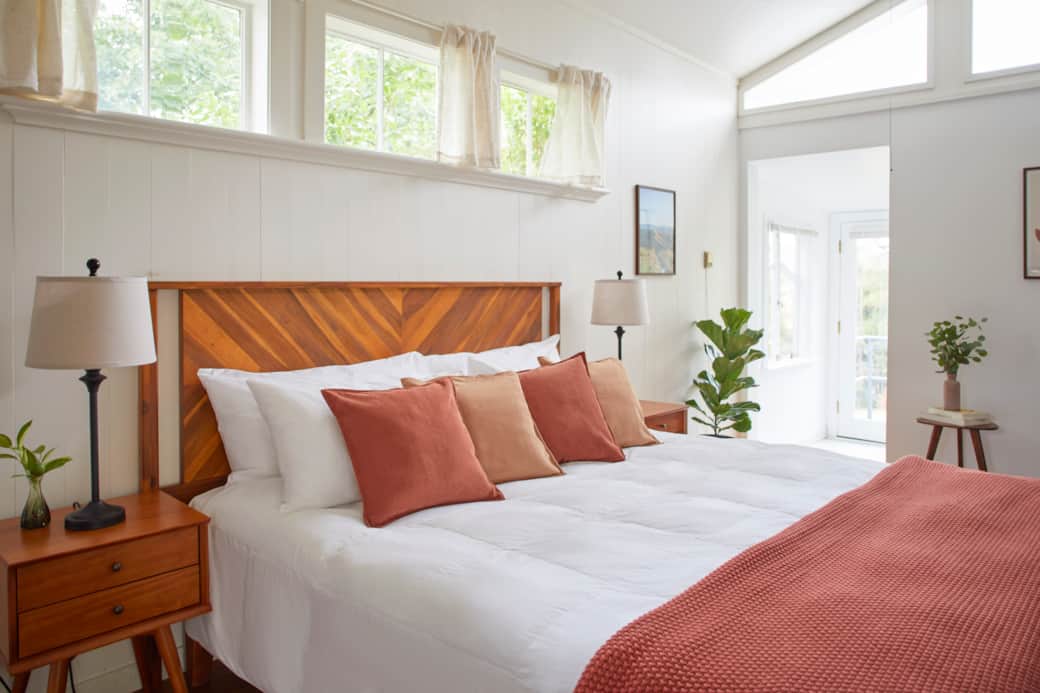 Tucked at the edge of the property, the Out to the Meadow Cottage captures the quiet romance of wine country living. Plan your day on the generous private patio overlooking the meadow while you sip your morning coffee, or relax with a glass of wine in the evening with the glimmer of the sunset in the distance. Inside, a plush king bed, cozy lounge area with a book nook, built-in wall fireplace, and spacious, spa-like walk-in shower create the ultimate restful retreat.