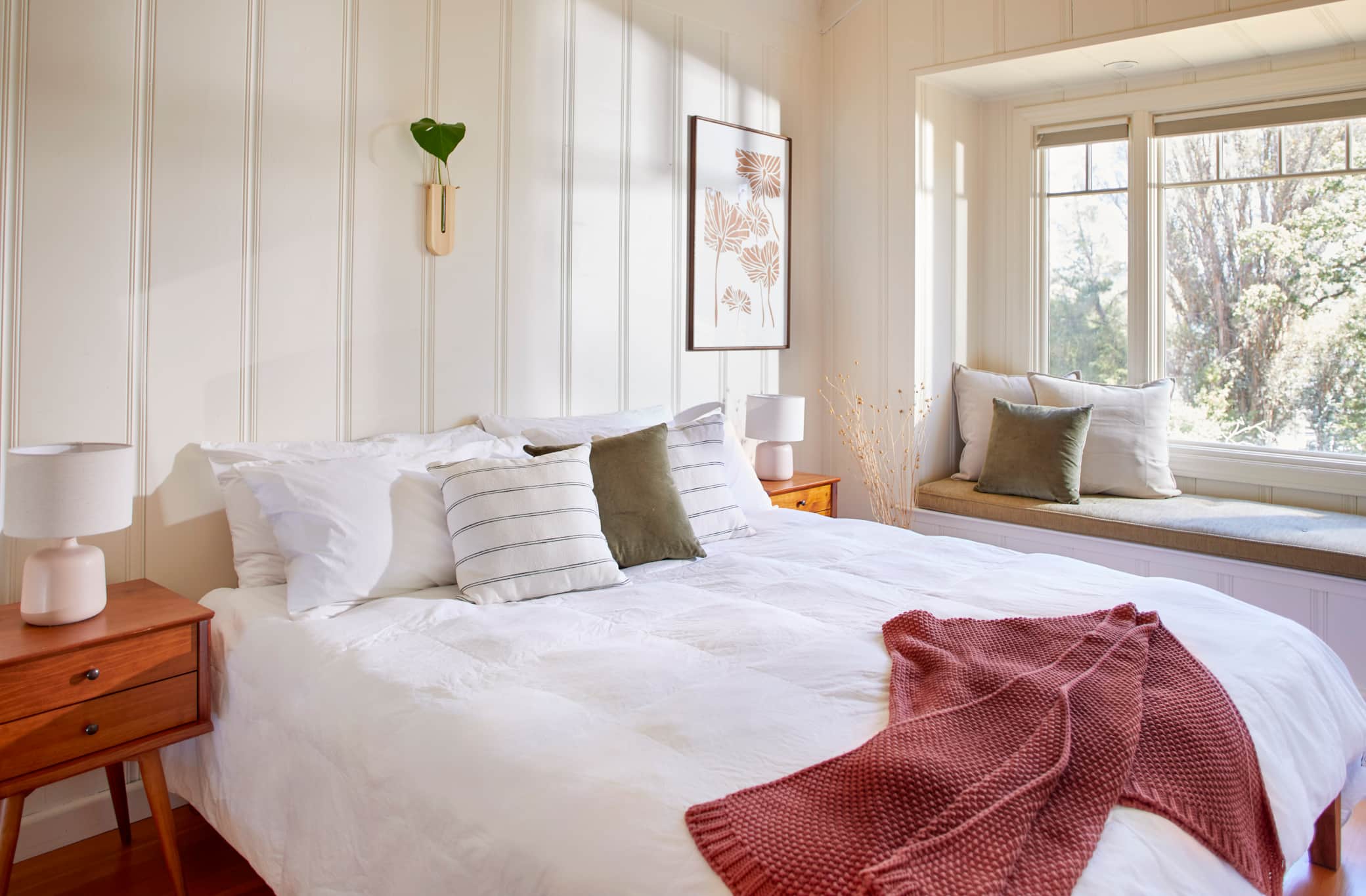 With a coastal farmhouse design, exposed beam ceiling, and a standalone fireplace, Flora is the coziest cottage at Casa Comunitá. Start the day on your own private patio that opens to our sweeping meadow, curl up in the comfy bay window with a book and cup of tea after a day exploring Healdsburg, and then sink into your plush king-sized bed at night. Flora is a true home away from home.