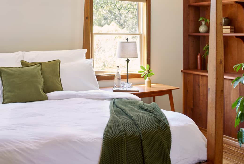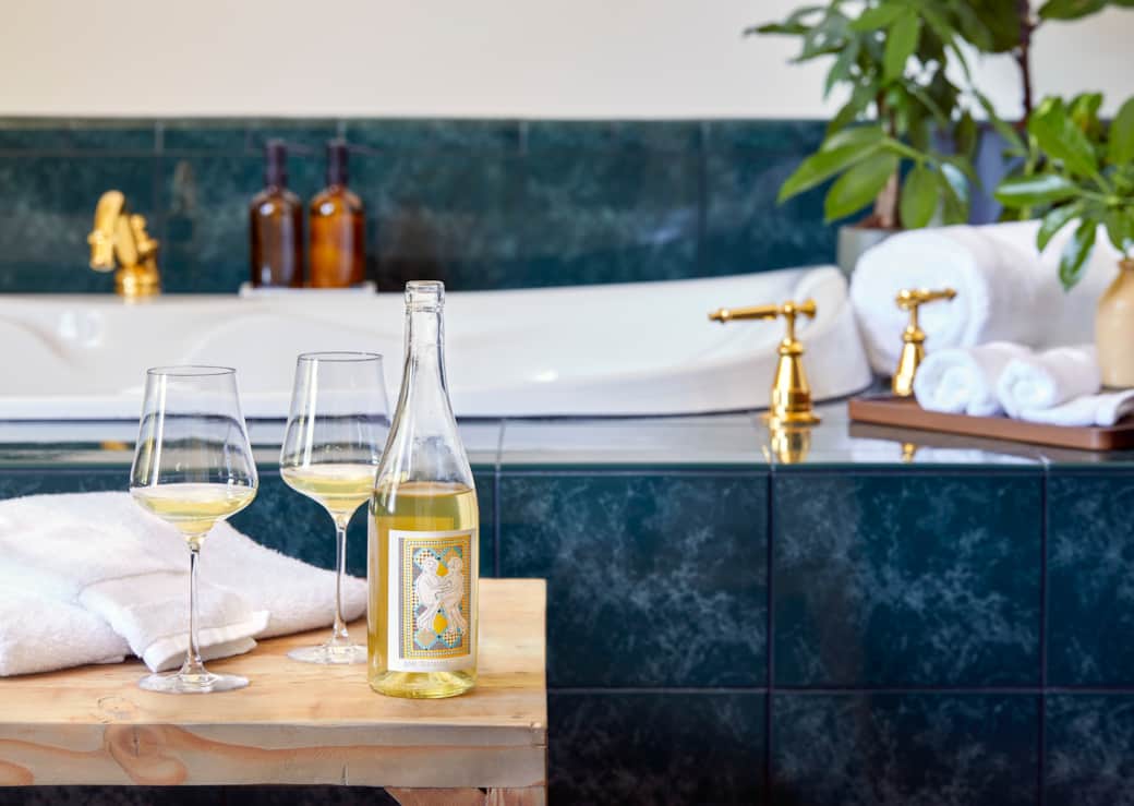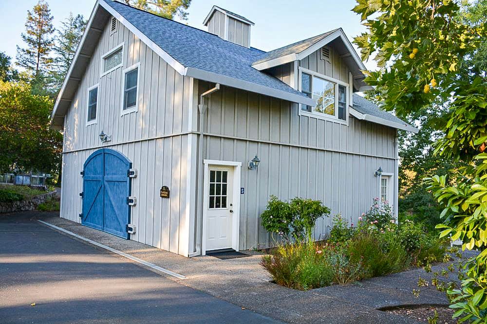 Flooded with natural light and framed by warm wood tones, the Poor Scholar Suite is where modern California design meets rustic craftsmanship. Unwind in the extra-large sunken tub, or curl up on the couch in front of the gas fireplace with a glass of wine as evening settles in. In the morning, wake up to views of the lush meadow, framed by towering trees and vineyards in the distance.